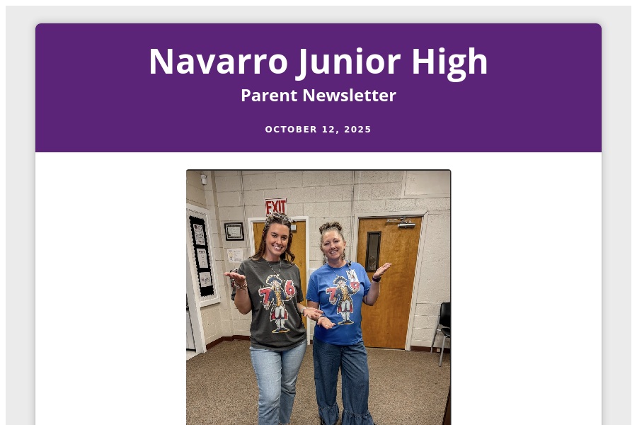 Navarro Junior High Parent Newsletter October 12, 2025 Upcoming Events HOMECOMING WEEK! Monday Teacher Professional Development Day Tuesda. . .
