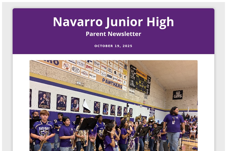 Navarro Junior High Parent Newsletter October 19, 2025 Upcoming Events Monday Board Meeting - 6:00 @ Intermediate Cafeteria Tuesday Fire Drill. . .